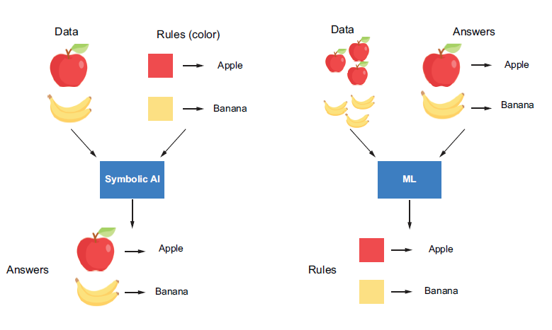 For example, suppose you want a machine to recognise images of apples and bananas automatically. With symbolic AI, you would need to provide human-readable rules associated with the reasoning process, perhaps specifying features like colour and shape, to the AI method. In contrast, an ML algorithm takes a bunch of images and their corresponding lables (“banana” or “apple”) and outputs the learned rules, which can be used to predict unlabeled images (figure 1).