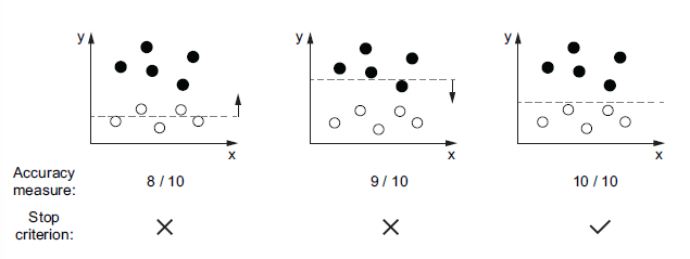 In the example shown in Figure 3, the learning algorithm takes two iterations to achieve the desired line, which separates all the input points correctly. But in practice, this criterion may not always be satisfied. It depends on the distribution of the input data, the selection model type, and how the model is measured and updated. We often need to choose different components and try different combinations to adjust the learning process to get the expected ML solution. Also, even if the learned model is able to label all the training inputs correctly, it is not guaranteed to work well on unseen data. In other words, the model’s ability to generalise may not be good. It’s important to select the components and adjust the learning process carefully.