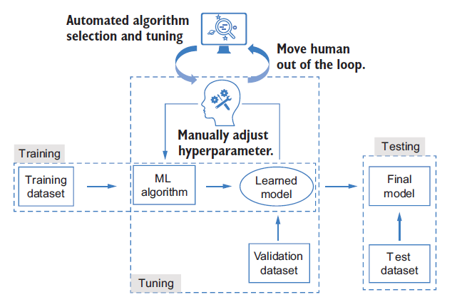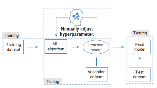 The selection of an optimal combination of hyperparameters for an ML algorithm is callled hyperparameter tuning and is often done through an iterative process. In each iteration, we select a set of hyperparameters to use to learn an ML model with the training dataset. The ML algorithm block in Figure 4 denotes the learning process described in the Figure 2. By evaluating each learned model on a separate dataset called the validation set, we can then pick the best one as the final model. We can evaluate the generalizability of that model using another dataset called the test set, which concludes the whole ML workflow.