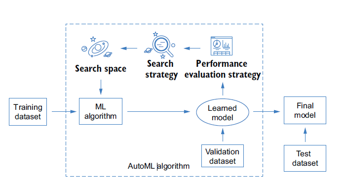 - Search Strategy - a strategy to select the optimal set of hyperparameters from the search space. Because AutoML is often an iterative trial-and-error process, the strategy often sequentially selects the hyperparameters in the search space and evaluates their performance. It may loop through all the hyperparameters in the search space, or the search strategy may be adapted based on the hyperparameters that have been evaluated so far to increase the efficiency of the later trials. A better search strategy can help us to achieve a better ML solution within the same amount of time. It may also allow us to use a larger search space by reducing the search time and computational cost.